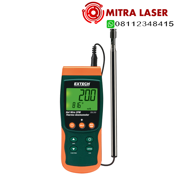 Extech SDL350 Thermo Anemometer adalah sebuah alat hot‑wire thermo‑anemometer / datalogger yang dirancang untuk mengukur kecepatan udara (air velocity), aliran udara (air flow / volumetric flow), dan suhu udara atau suhu permukaan (dengan probe termokopel eksternal).